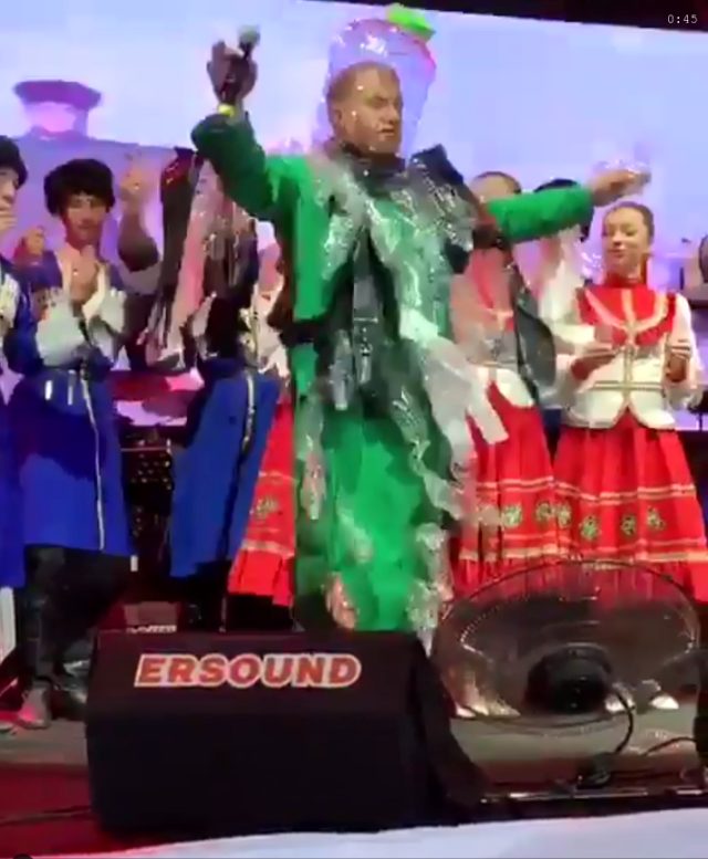 Aydın Aydın, Sıfır Atık Projesi’ne dikkat çekmek için plastik kıyafetle sahne çıktı. Aydın Aydın’ın görüntüsünü ve ilginç dansını görenler şaşkınlıklarını gizleyemediler.