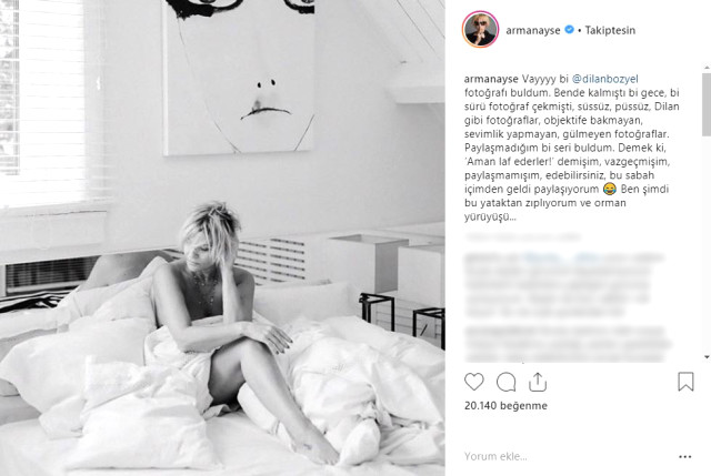 Ünlü gazeteci Instagram hesabından paylaştığı fotoğrafına, “Vayyyy bi @dilanbozyel fotoğrafı buldum. Bende kalmıştı bi gece, bi sürü fotoğraf çekmişti, süssüz, püssüz, Dilan gibi fotoğraflar, objektife bakmayan, sevimlilik yapmayan, gülmeyen fotoğraflar. Paylaşmadığım bi seri buldum. Demek ki, ‘Aman laf ederler!’ demişim, vazgeçmişim, paylaşmamışım, edebilirsiniz, bu sabah içimden geldi paylaşıyorum. Ben şimdi bu yataktan zıplıyorum ve orman yürüyüşü…” açıklamasını ekledi.