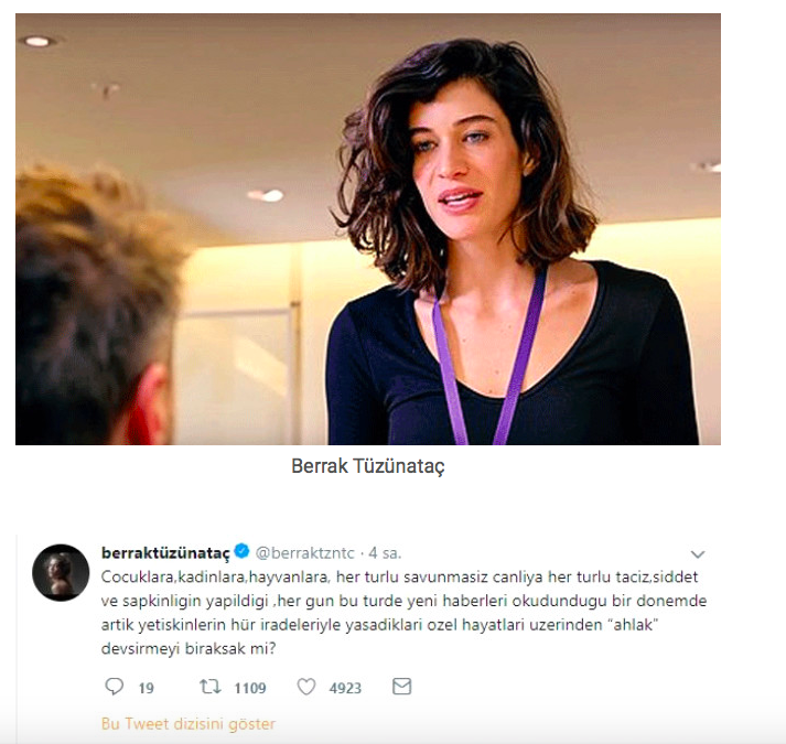 “Çocuklara, kadınlara, hayvanlara, her türlü savunmasız canlıya her türlü taciz, şiddet ve sapkınlığın yapıldığı, her gün bu türde yeni haberlerin okunduğu bir dönemde artık yetişkinlerin hür iradeleriyle yaşadıkları özel hayat hayatları üzerinden “ahlak” devşirmeyi bıraksak mı? Çok sahte oluyor zira.”