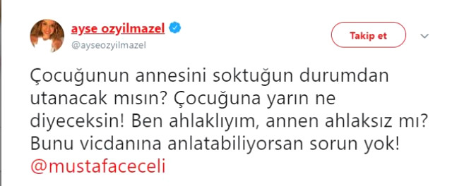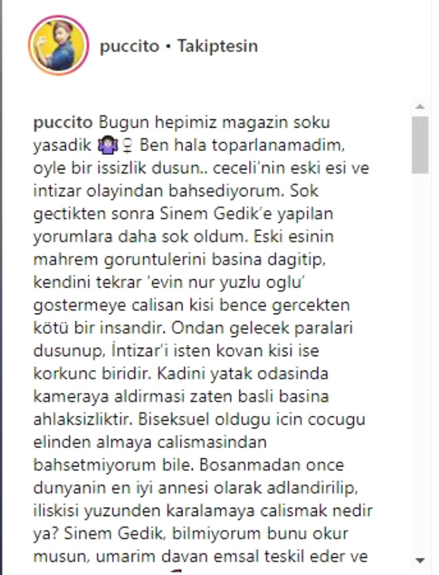 “Bugün hepimiz magazin şoku yaşadık. Ben hala toparlanamadım, öyle bir işsizlik düşün… Mustafa Ceceli’nin eski eşi ve İntizar olayından bahsediyorum. Şok geçtikten sonra Sinem Gedik’e yapılan yorumlara daha şok oldum. Eski eşinin mahrem görüntülerini basına dağıtıp, kendini tekrar ‘evin nur yüzlü oğlu’ göstermeye çalışan kişi bence gerçekten kötü bir insandır. Ondan gelecek paraları düşünüp, İntizar’ı işten kovan kişi ise korkunç biridir. Kadını yatak odasında kameraya aldırması zaten başlı başına ahlaksızlıktır. Biseksüel olduğu için çocuğu elinden almaya çalışmasından bahsetmiyorum bile. Boşanmadan önce dünyanın en iyi annesi olarak adlandırılıp, ilişkisi yüzünden karalamaya calışmak nedir ya? Sinem Gedik, bilmiyorum bunu okur musun, umarım davan emsal teşkil eder ve sen kazanırsın… Ayrıca Mustafa Ceceli mi İntizar mı deseler İntizar tabii ya.”