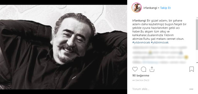 Oyuncu İrfan Kangı Öcek’in hayatını kaybettiğini sosyal medya üzerinden bu sözlerle duyurdu: “Bir güzel adamı, bir şahane adamı daha kaybetmişiz bugün. Neşeli bir şekilde oyuna hazırlanırken geldi acı haber. Bu akşam tüm alkış ve kahkahalar ,dualarımızla Yıldırım abimize. Ruhu şad mekanı cennet olsun.”