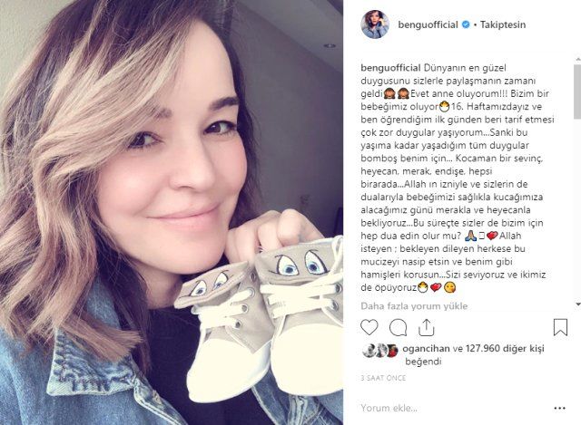 Sosyal medya hesabından hamile olduğunu duyuran Bengü, “Dünyanın en güzel duygusunu sizlerle paylaşmanın zamanı geldi. Evet anne oluyorum!!! Bizim bir bebeğimiz oluyor. 16. Haftamızdayız ve ben öğrendiğim ilk günden beri tarif etmesi çok zor duygular yaşıyorum…Sanki bu yaşıma kadar yaşadığım tüm duygular bomboş benim için… Kocaman bir sevinç, heyecan, merak, endişe, hepsi birarada…Allah ın izniyle ve sizlerin de dualarıyla bebeğimizi sağlıkla kucağımıza alacağımız günü merakla ve heyecanla bekliyoruz…Bu süreçte sizler de bizim için hep dua edin olur mu? Allah isteyen ; bekleyen dileyen herkese bu mucizeyi nasip etsin ve benim gibi hamişleri korusun…Sizi seviyoruz ve ikimiz de öpüyoruz.” ifadelerini kullandı.
