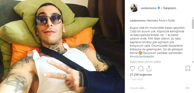 Kaza geçirdiğini sosyal medya hesabından takipçileriyle paylaşan Can Bonomo, “Bugün ufak bir motosiklet kazası geçirdim. Ciddi bir durum yok. Köprücük kemiğimde ve kaburgamda kırıklar var. 1 ay kadar yatarım evde. Film falan izlerim. Şu taksi kapılarını kovboy gibi açmayın çok kırılıyorum valla. Önümüzdeki konserlerin birkaçına da gelemiycem. Siz de gitmeyin bence.” ifadelerini kullandı.
