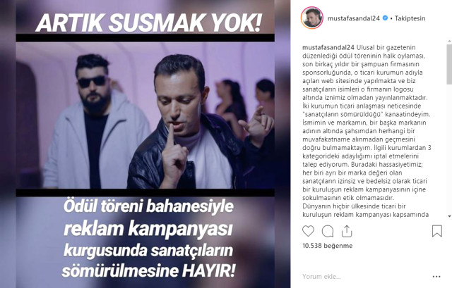 Ünlü şarkıcı Mustafa Sandal’ın sosyal medya hesabından yaptığı paylaşımda, “Ulusal bir gazetenin düzenlediği ödül töreninin halk oylaması, son birkaç yıldır bir şampuan firmasının sponsorluğunda, o ticari kurumun adıyla açılan web sitesinde yapılmakta ve biz sanatçıların isimleri o firmanın logosu altında iznimiz olmadan yayınlanmaktadır. İki kurumun ticari anlaşması neticesinde “sanatçıların sömürüldüğü” kanaatindeyim. İsmimin ve markamın, bir başka markanın adının altında şahsımdan herhangi bir muvafakatname alınmadan geçmesini doğru bulmamaktayım. İlgili kurumlardan 3 kategorideki adaylığımı iptal etmelerini talep ediyorum. Buradaki hassasiyetimiz; her biri ayrı bir marka değeri olan sanatçıların izinsiz ve bedelsiz olarak ticari bir kuruluşun reklam kampanyasının içine sokulmasının etik olmamasıdır. Dünyanın hiçbir ülkesinde ticari bir kuruluşun reklam kampanyası kapsamında bir sanatçının kendi eseriyle ilgili ödüllendirilme bahanesiyle o logoya bedelsiz ve izinsiz hizmet ettirildiği görülmemiştir! Bahsi geçen kurumların beni aday listesinden çıkarmalarını rica ediyorum.” dedi.