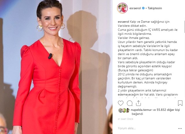 Ünlü sunucu Esra Erol, sosyal medya hesabından geçtiğimiz cuma günü iç varis ameliyatını olduğunu duyurarak kendisini takip edenleri hastalık hakkında uyardı.