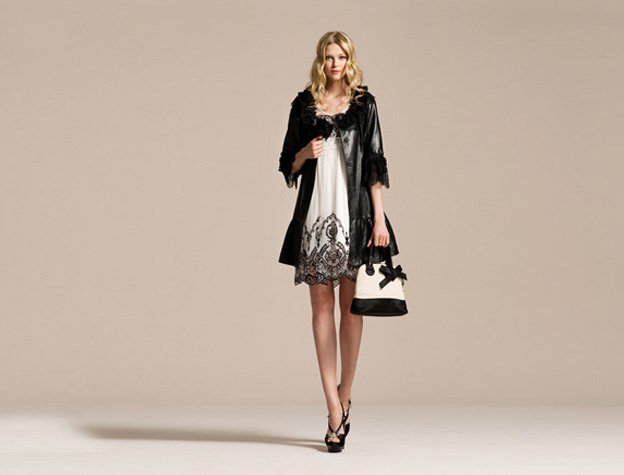 Dantel aplikeli, uzun siyah deri ceket, beli dantel aplikeli, ekru üzerine siyah dantel motifli elbise ve Vakko Ayakkabı bir araya gelmiş ve çok şık bir kombin ortaya çıkmış…