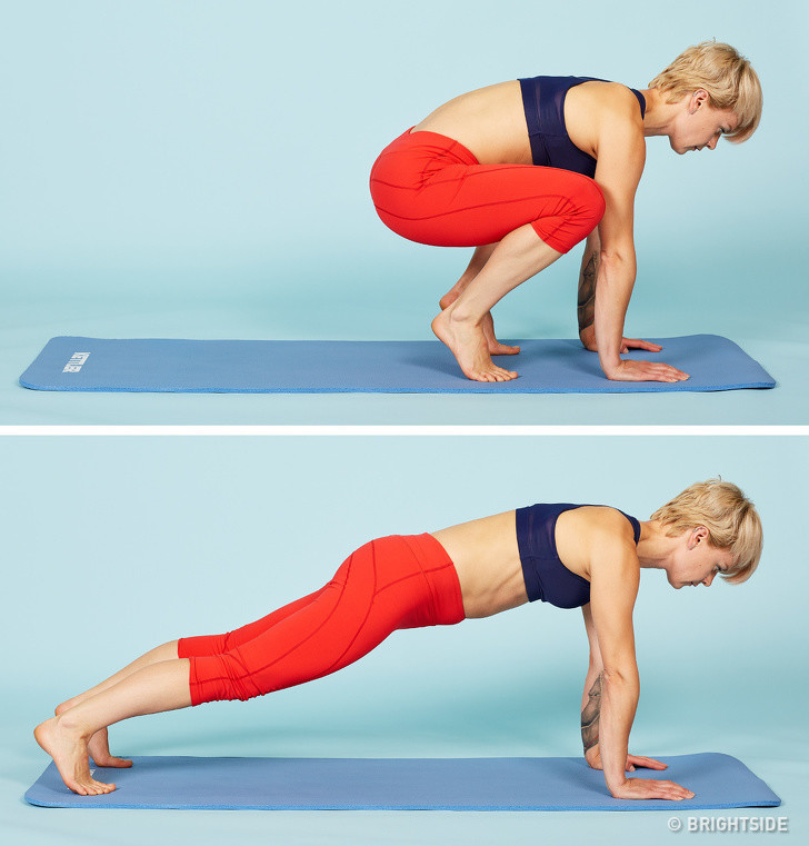 Bu egzersizi yaparken sırtınızı incitmemeye dikkat edin. Bir kaç saniye boyunca plank pozisyonunda durun ve daha sonra zıplayarak ilk resimdeki pozisyona geri dönün. 15-20 defa tekrarlayın.