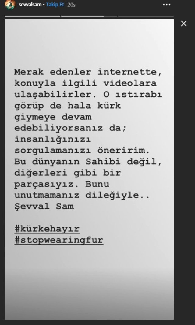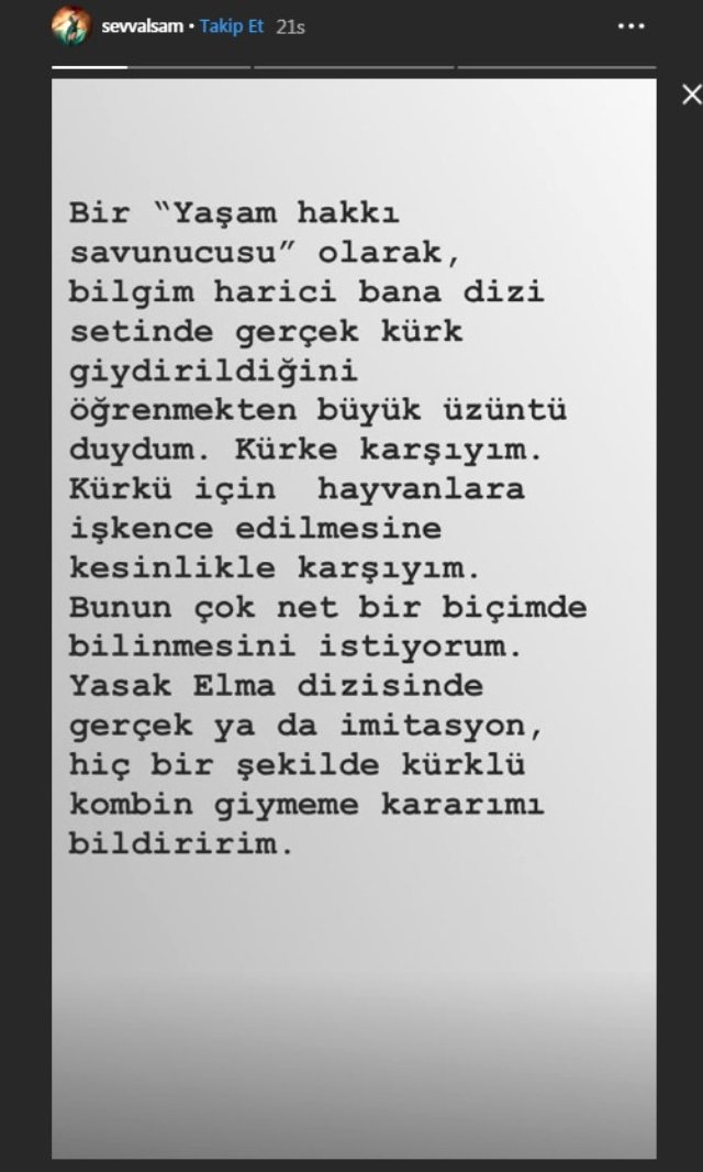 FOX TV’de yayınlanan Yasak Elma dizisinin setinde yaşanan olaylara bir yenisi daha eklendi. Başrol oyuncusu Şevval Sam, sette kendisine bilgisi dışında gerçek kürk giydirilmesine sosyal medyadan isyan etti.