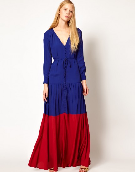 Mavi kırmızı uzun kollu V yaka bir elbise modeli hem yazın hem kışın kullanılacak modellerdeni birisi