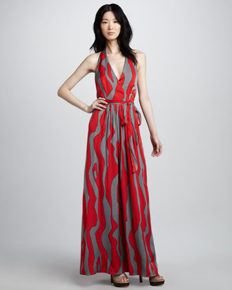 Kırmızı giri boydan desenli boyundan bağlamalı beli kuşaklı maksi boy elbise yazın bayanların en çok tercih ettiği modeller arasında