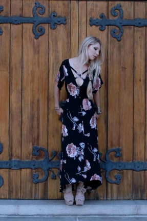 Yakasında çarpraz askılar maksi boy büyük gül desenleri elbisede tam bir yaz havası görünümü var