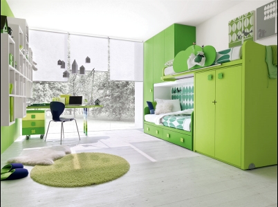 Modern ve oldukça fonksiyonel bir yeşil renk çocuk odası dizaynı.