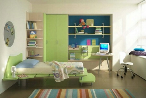 Çok flu bir şekilde dekore edilmiş yeşil renk çocuk odası modeli.