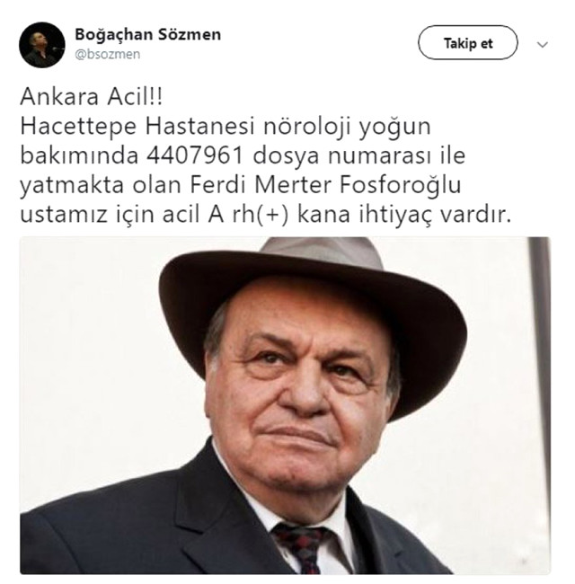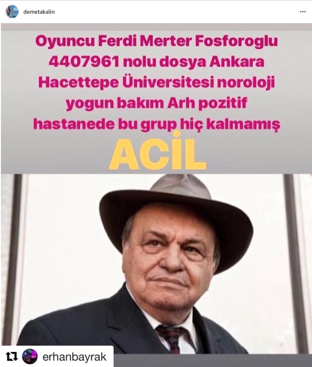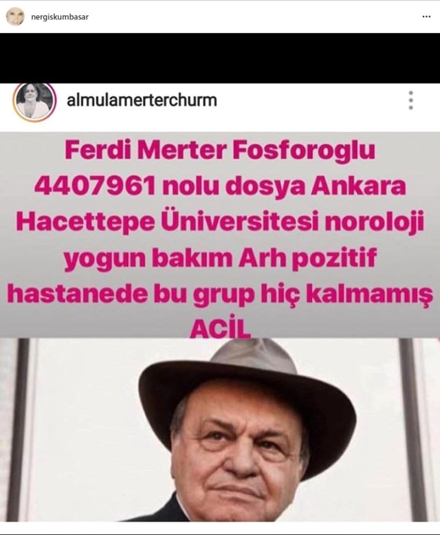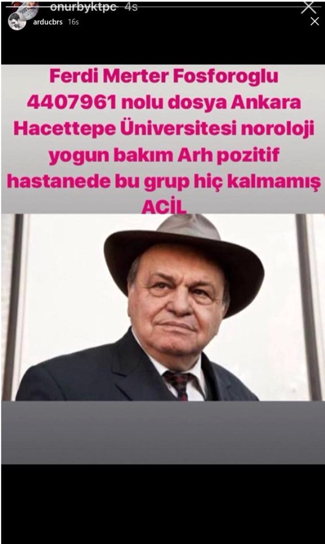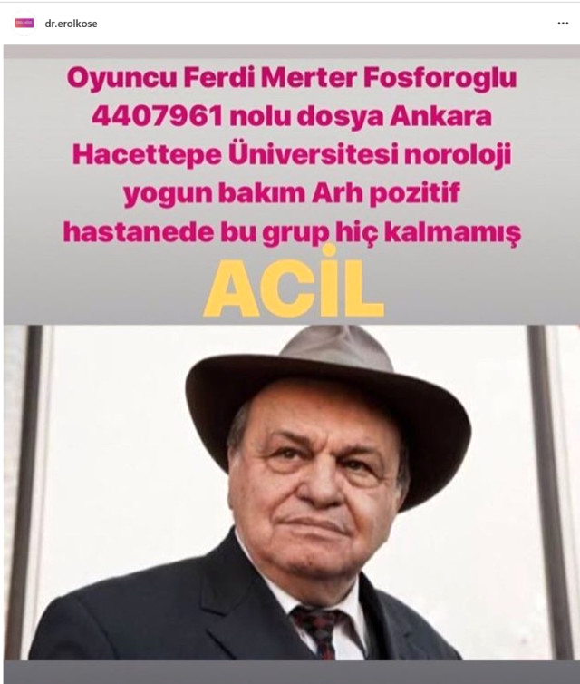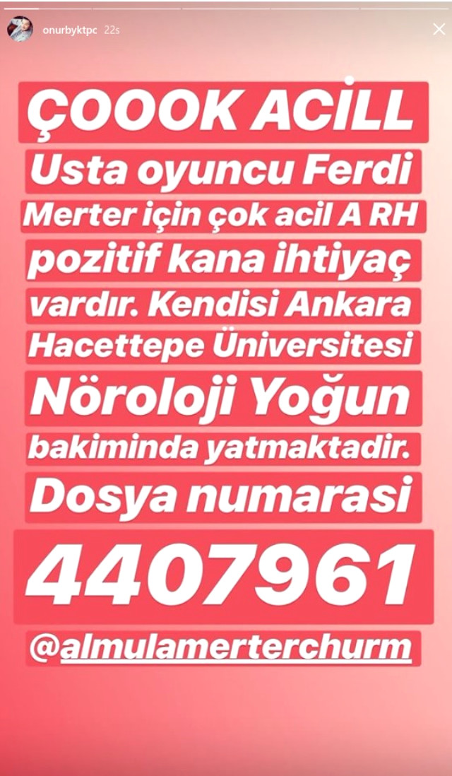 Yaşadığı talihsiz olayın ardından yaklaşık 7 aydır hastanede olan 78 yaşındaki usta oyuncu Ferdi Merter Fosforoğlu için acil kan çağrısında bulunuldu. Kiralık Aşk dizisinde zengin iş adamı rolüyle tanınan usta oyuncuyu, set arkadaşları unutmadı. Barış Arduç ve Onur Büyüktopçu olmak üzere birçok ünlü isim, sosyal medyadan Merter için kan çağrısında bulundu.