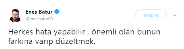 Batur, sosyal paylaşım platformu Twitter’da yaptığı açıklamada ”Herkes hata yapabilir , önemli olan bunun farkına varıp düzeltmek.” diyerek kendini savundu.