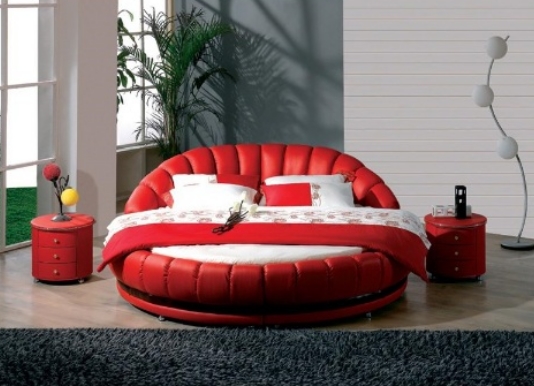 Kırmızı renkte tasarlanmış, oldukça dikkat çekici kırmızı rengiyle şık deri yuvarlak yatak modeli.