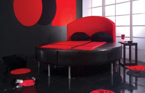 Siyah ve kırmızı tasarımıyla şık yuvarlak yatak modeli.